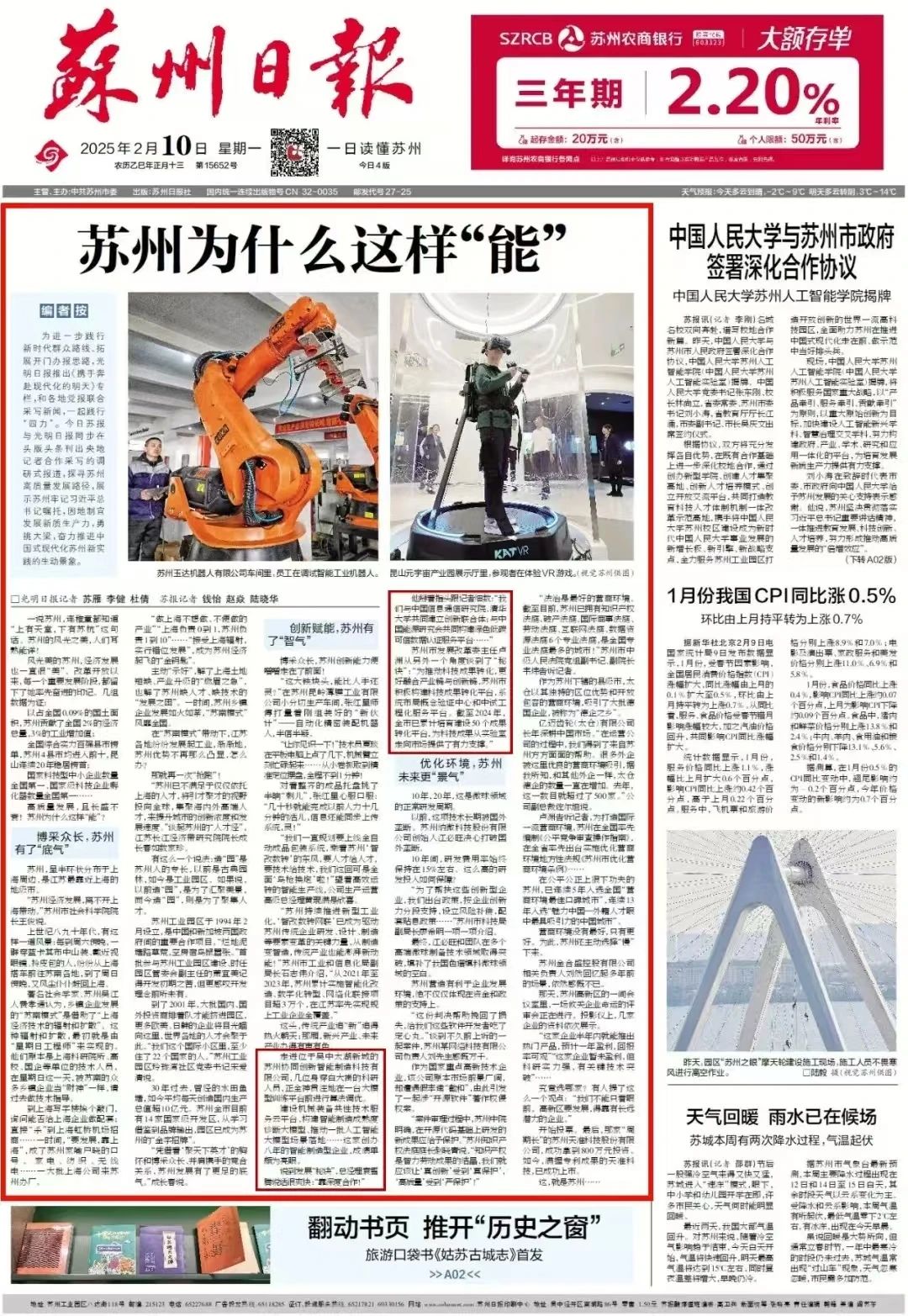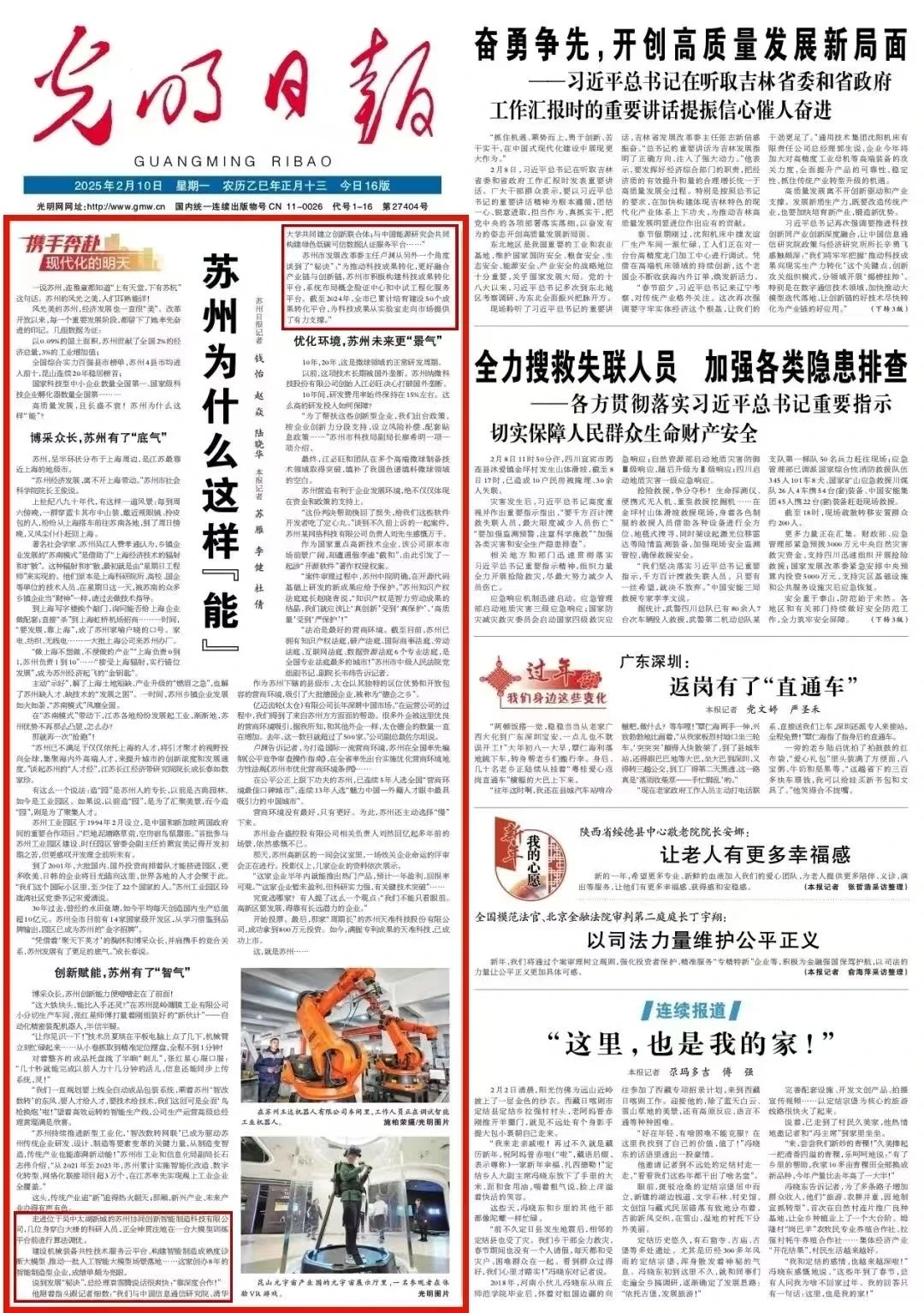 近年来,苏州深入践行习近平总书记的嘱托,积极探索科技创新与高质量发展的新路径,因地制宜培育新质生产力,在制造业转型升级的赛道上不断加速奔跑。2月10日,《光明日报》、《苏州日报》头版聚焦吴中太湖新城的苏州协同创新智能制造科技有限公司,以央地记者合作采写的调研式报,展现了这家新生代智能制造企业在中国式现代化苏州新实践中的卓越贡献。