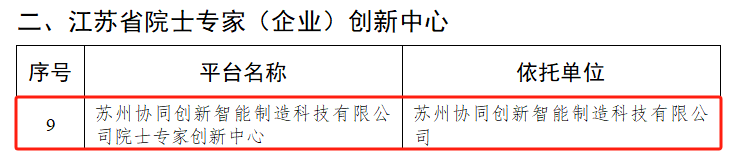 近日,江苏省科协公布了“2024年江苏省院士专家创新中心”名单,苏州协同创新智能制造科技有限公司院士专家创新中心入选,也是吴中区唯一入选的单位。