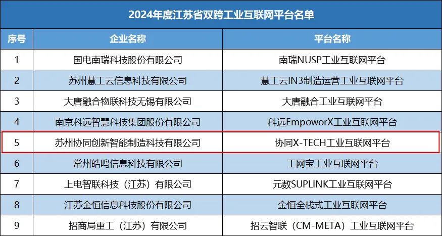 7月10日,江苏省工业和信息化厅公示了2024年度江苏省5G工厂和工业互联网平台名单,协同科技成功入选2024年度江苏省双跨工业互联网平台。