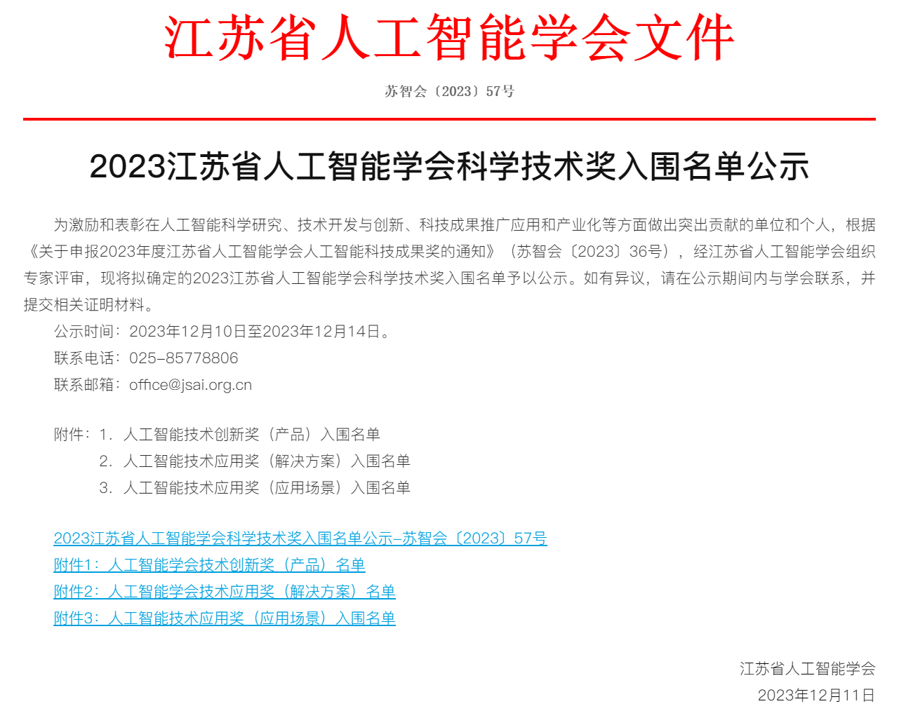 近日,江苏省人工智能学会公示“2023江苏省人工智能学会科学技术奖入围名单”,协同科技成功入库!