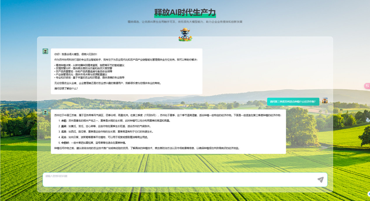 公司自主研发的数智农业谷语大模型,经过不断迭代升级,已实现“农业灌溉/施肥决策准确率突破92%”、“农机故障预警实现48小时提前预判”两项关键指标,通过在中国农垦、苏州花卉示范园、碧螺春产业链平台及海南热带作物示范园等多种场景的成功应用,积累了丰富落地经验,为提升农业产业竞争力、经济效益与行业韧性贡献力量。