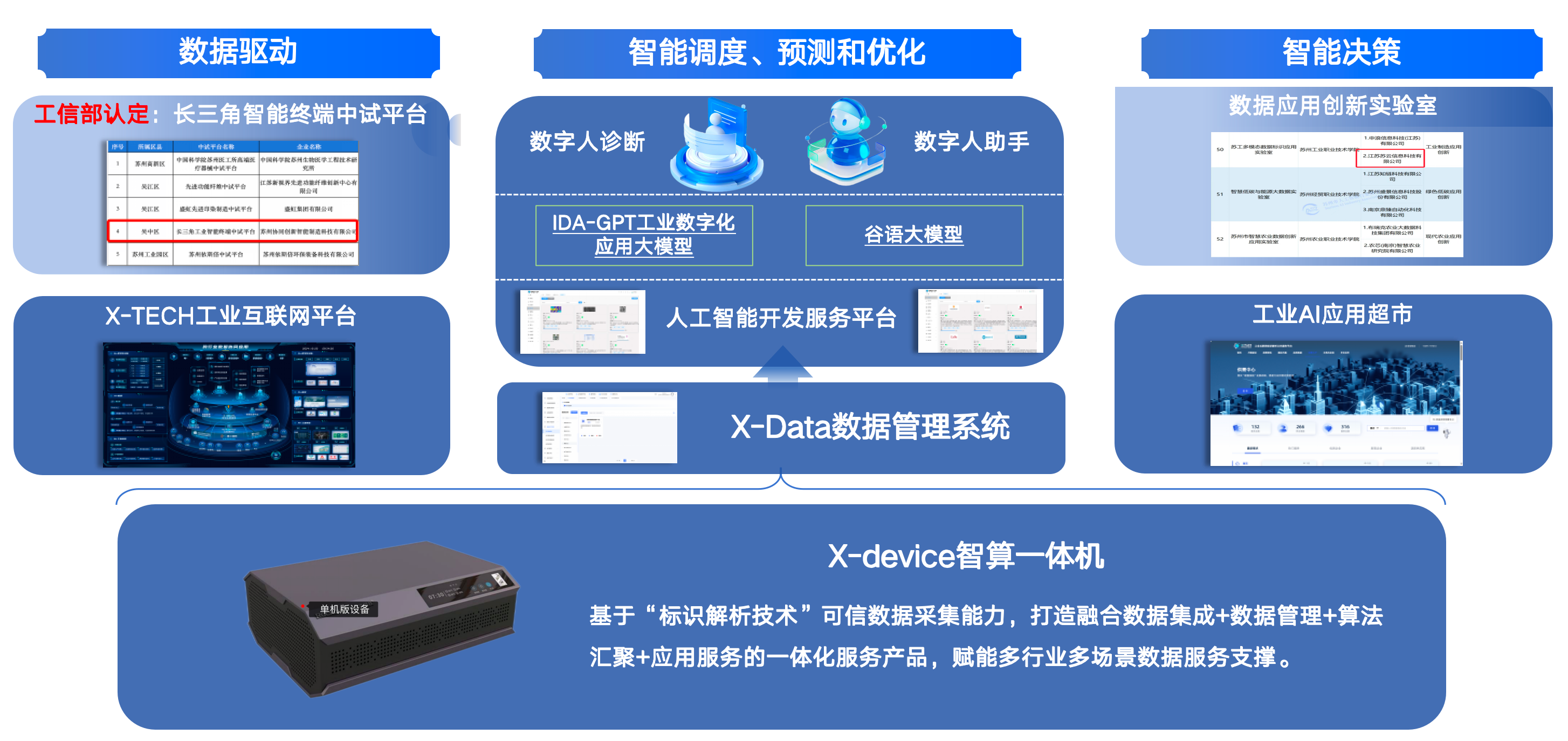 在数据采集终端,X-device智算一体机通过标识解析技术构建可信数据采集体系,集成IOT设备、企业节点与二级节点数据对接能力,实现硬件/软件/平台数据的全链路可信采集。