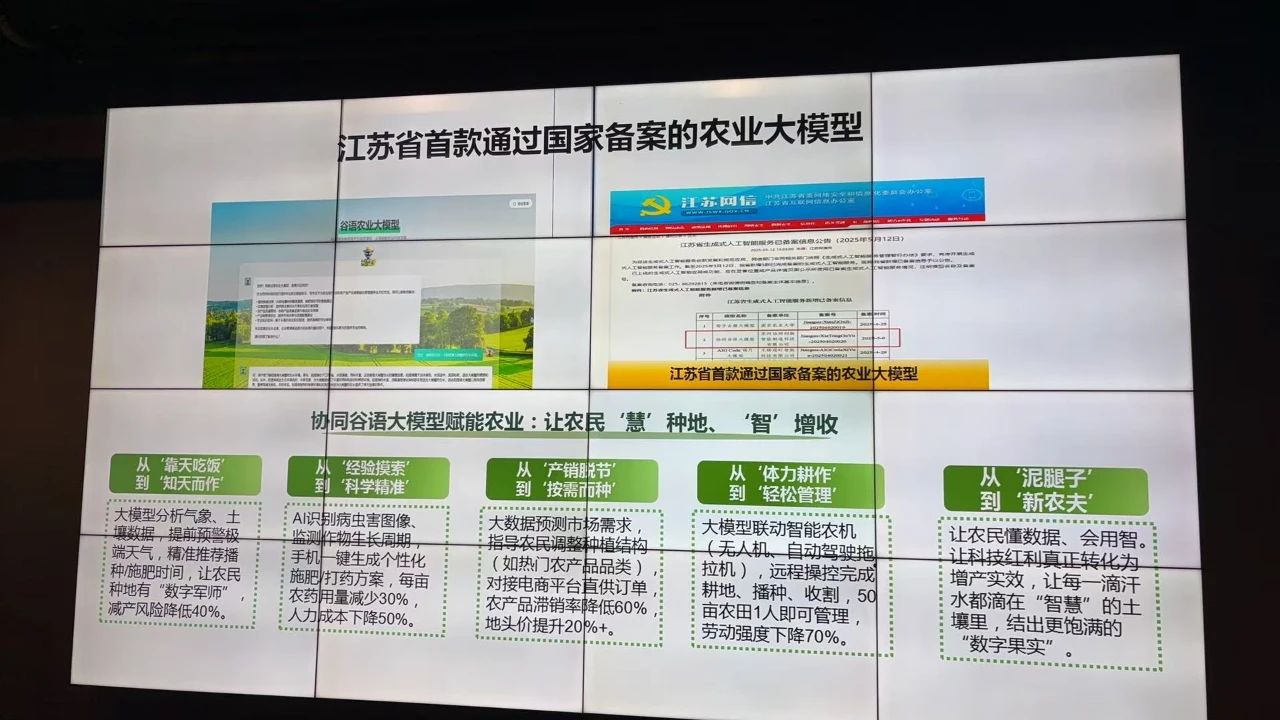 调研组此行重点考察了协同科技自主研发的谷语大模型,对其关键技术、应用场景、安全治理及发展前景等进行了深入了解。作为江苏省内首款通过国家网信办备案的农业大模型,谷语大模型在数据安全可信采集、隐私保护机制建设等方面展现出的合规性与安全性走在行业前列。其核心应用能力覆盖精准种植决策、农产品质量管控、产业链智能化管理等关键环节,有力驱动农业生产方式革新与管理效能跃升,成为推动农业现代化转型的重要引擎。