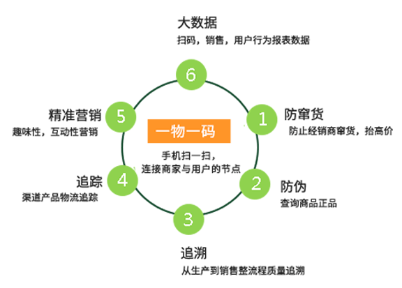 实现产品生产环节、仓储环节、销售环节、流通环节和服务环节的全生命周期管理,有效防伪,从而保证企业利益,维护企业品牌形象。